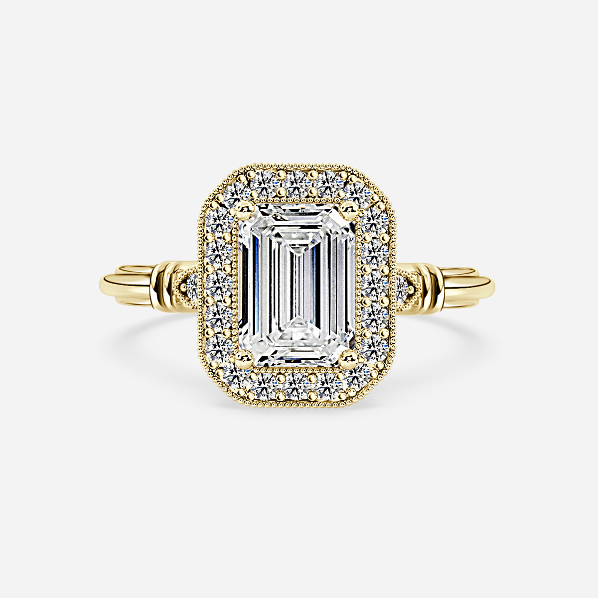 A milgrain halo engagement ring with one diamond on each side is a classic and elegant style of engagement ring. The milgrain detailing adds a vintage touch, while the halo design and side diamonds add extra sparkle and glamour to the ring. Handcrafted in Hatton Garden, London Centre Diamond Not Included Setting Only