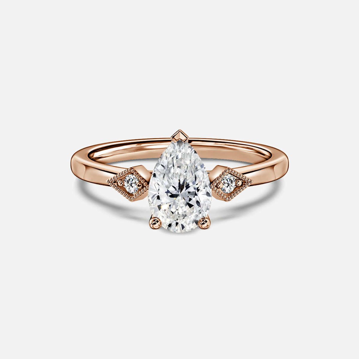 The Athira Rose Gold Vintage Engagement Ring features a single diamond on each side of the center stone, elegantly set within intricate vintage metalwork. This exquisite design combines timeless charm with meticulous craftsmanship for a truly captivating piece. Handcrafted in Hatton Gardens, London. Centre Diamond Not Included Setting Only