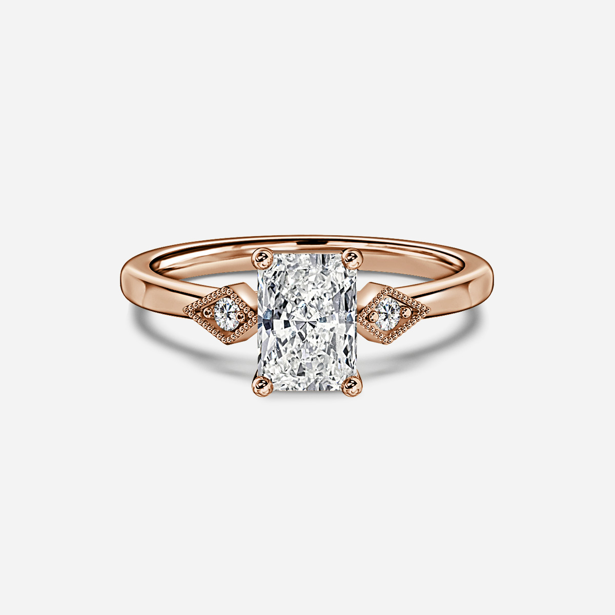 The Athira Rose Gold Vintage Engagement Ring features a single diamond on each side of the center stone, elegantly set within intricate vintage metalwork. This exquisite design combines timeless charm with meticulous craftsmanship for a truly captivating piece. Handcrafted in Hatton Gardens, London. Centre Diamond Not Included Setting Only