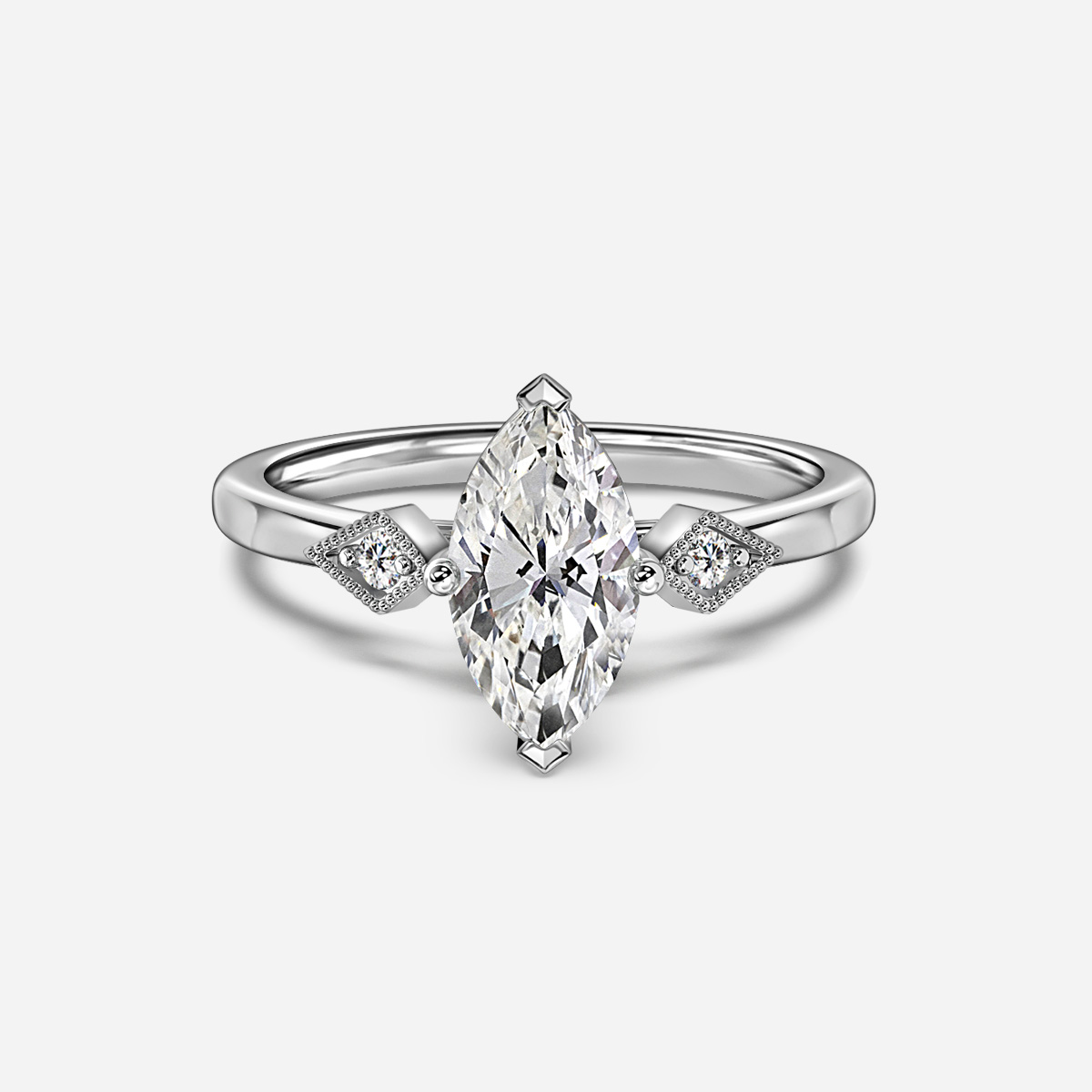 The Athira White Gold Vintage Engagement Ring features a single diamond on each side of the center stone, elegantly set within intricate vintage metalwork. This exquisite design combines timeless charm with meticulous craftsmanship for a truly captivating piece. Handcrafted in Hatton Gardens, London. Centre Diamond Not Included Setting Only