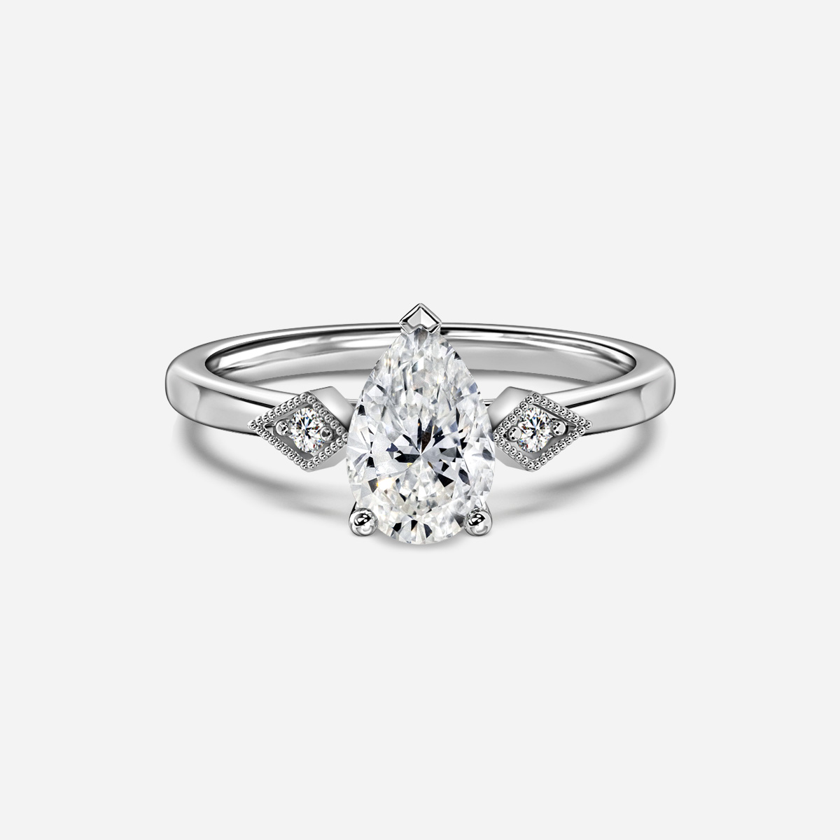 The Athira White Gold Vintage Engagement Ring features a single diamond on each side of the center stone, elegantly set within intricate vintage metalwork. This exquisite design combines timeless charm with meticulous craftsmanship for a truly captivating piece. Handcrafted in Hatton Gardens, London. Centre Diamond Not Included Setting Only