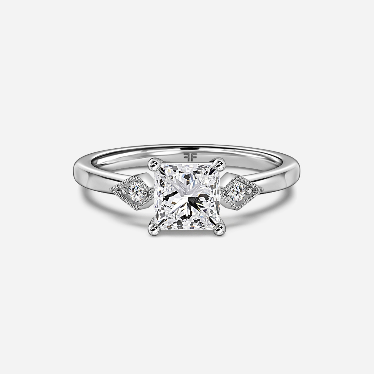 The Athira White Gold Vintage Engagement Ring features a single diamond on each side of the center stone, elegantly set within intricate vintage metalwork. This exquisite design combines timeless charm with meticulous craftsmanship for a truly captivating piece. Handcrafted in Hatton Gardens, London. Centre Diamond Not Included Setting Only