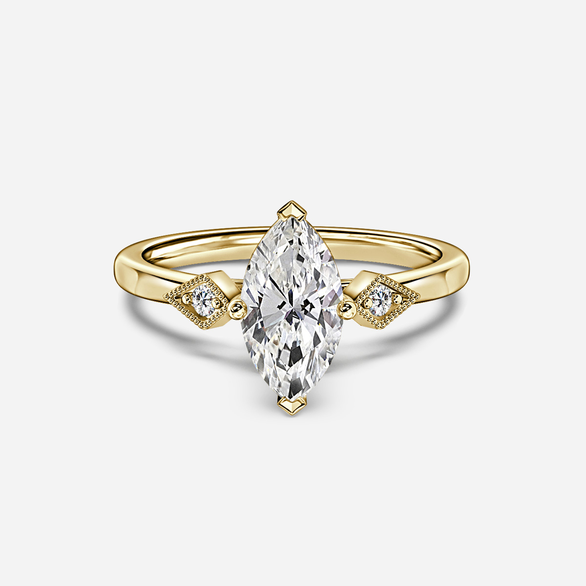 The Athira Yellow Gold Vintage Engagement Ring features a single diamond on each side of the center stone, elegantly set within intricate vintage metalwork. This exquisite design combines timeless charm with meticulous craftsmanship for a truly captivating piece. Handcrafted in Hatton Gardens, London. Centre Diamond Not Included Setting Only