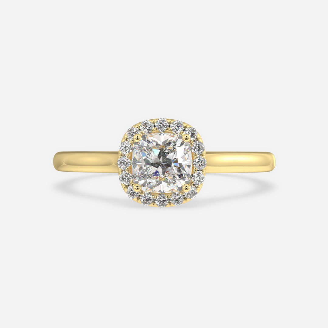 A captivating halo of pavé-set diamonds surrounds the center gem of this timelessly elegant ring. Crafted in traditional yellow gold showcase a center diamond. Handcrafted in Hatton Garden, London Centre Diamond Not Included Setting Only