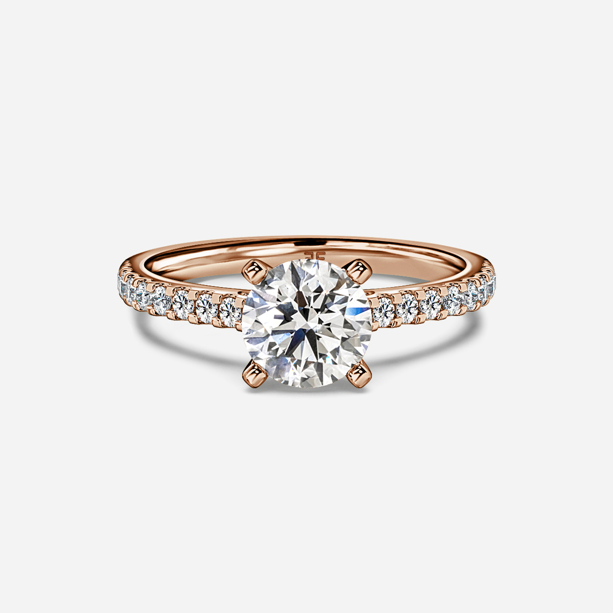A rose gold pave engagement ring features round diamonds that sparkle from half-way around the band, creating an eye-catching piece you will love. Handcrafted in Hatton Garden, London Centre Diamond Not Included Setting Only