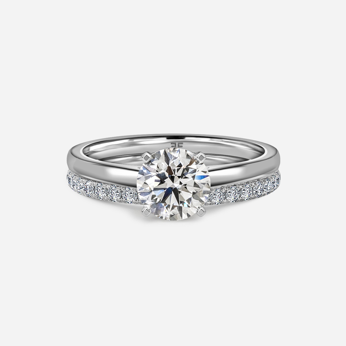 The Avery Solitaire Platinum Pave Band Bridal Set Engagement Ring features a stunning solitaire engagement ring paired with a delicate diamond band wedding band, offering timeless elegance and sophistication in its design. Handcrafted in Hatton Gardens, London. Centre Diamond Not Included Setting only.