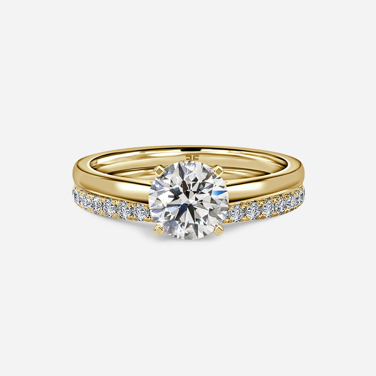 The Avery Solitaire Yellow Gold Pave Band Bridal Set Engagement Ring features a stunning solitaire engagement ring paired with a delicate diamond band wedding band, offering timeless elegance and sophistication in its design. Handcrafted in Hatton Gardens, London. Centre Diamond Not Included Setting only.