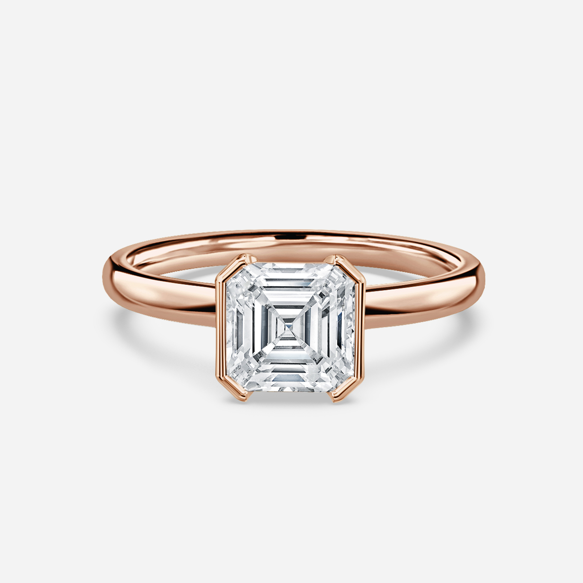 This beautiful modern rose gold engagement ring features a bezel-set center diamond with a sleek band for a contemporary look. The elevated bezel allows for maximum light play and accommodates a variety of wedding band styles to tuck underneath. Handcrafted in Hatton Gardens, London. Centre Diamond Not Included Setting only