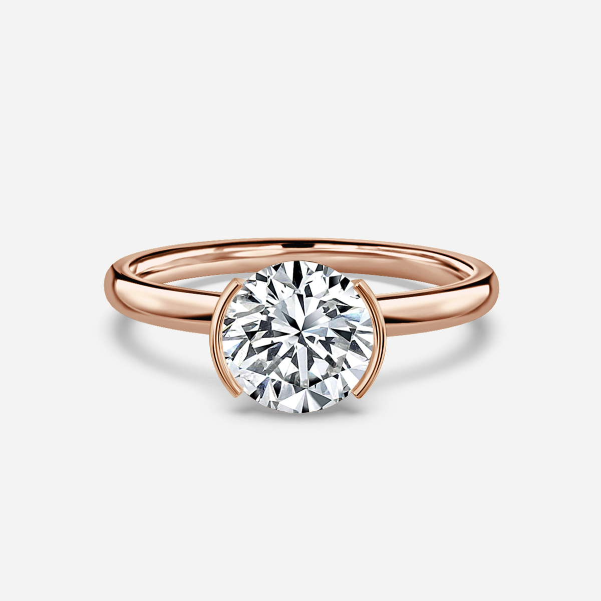 This beautiful modern rose gold solitaire engagement ring features a bezel-set center diamond with a sleek band for a contemporary look. The elevated bezel allows for maximum light play and accommodates a variety of wedding band styles to tuck underneath. Handcrafted in Hatton Gardens, London. Centre Diamond Not Included Setting only