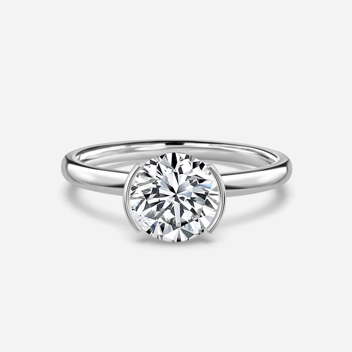 This beautiful modern white gold solitaire engagement ring features a bezel-set center diamond with a sleek band for a contemporary look. The elevated bezel allows for maximum light play and accommodates a variety of wedding band styles to tuck underneath. Handcrafted in Hatton Gardens, London. Centre Diamond Not Included Setting only