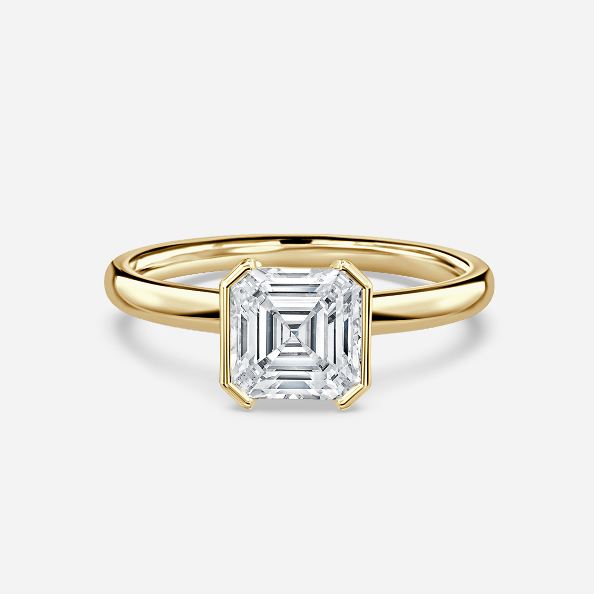 This beautiful modern yellow gold engagement ring features a bezel-set center diamond with a sleek band for a contemporary look. The elevated bezel allows for maximum light play and accommodates a variety of wedding band styles to tuck underneath. Handcrafted in Hatton Gardens, London. Centre Diamond Not Included Setting only