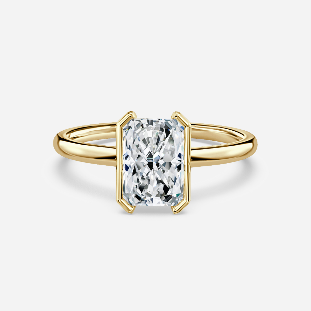 This beautiful modern yellow gold engagement ring features a bezel-set center diamond with a sleek band for a contemporary look. The elevated bezel allows for maximum light play and accommodates a variety of wedding band styles to tuck underneath. Handcrafted in Hatton Gardens, London. Centre Diamond Not Included Setting only