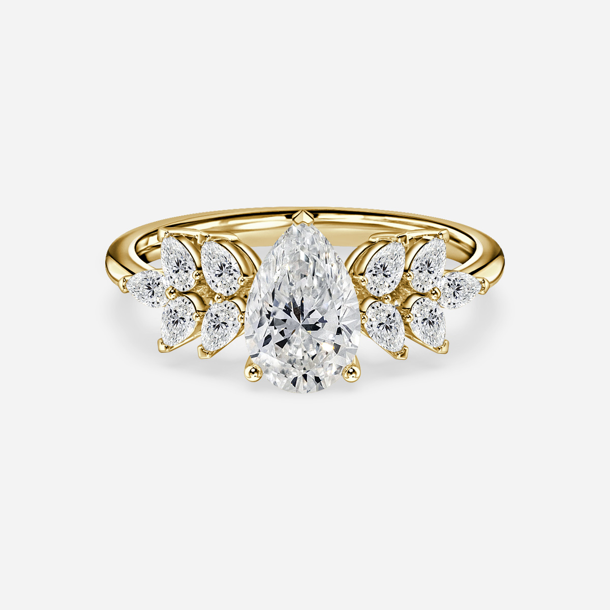 This yellow gold eleven stone engagement ring features a shared setting to provide the highest possible level of radiance. This design allows for a continuous and dazzling stream of light to pass through the stones. Handcrafted in Hatton Gardens, London. Centre Diamond Not Included Setting only