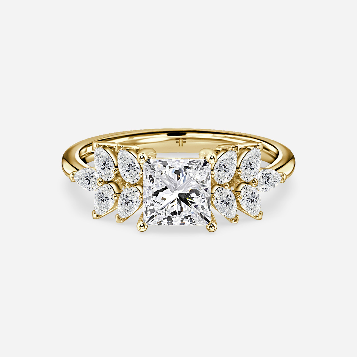 This yellow gold eleven stone engagement ring features a shared setting to provide the highest possible level of radiance. This design allows for a continuous and dazzling stream of light to pass through the stones. Handcrafted in Hatton Gardens, London. Centre Diamond Not Included Setting only