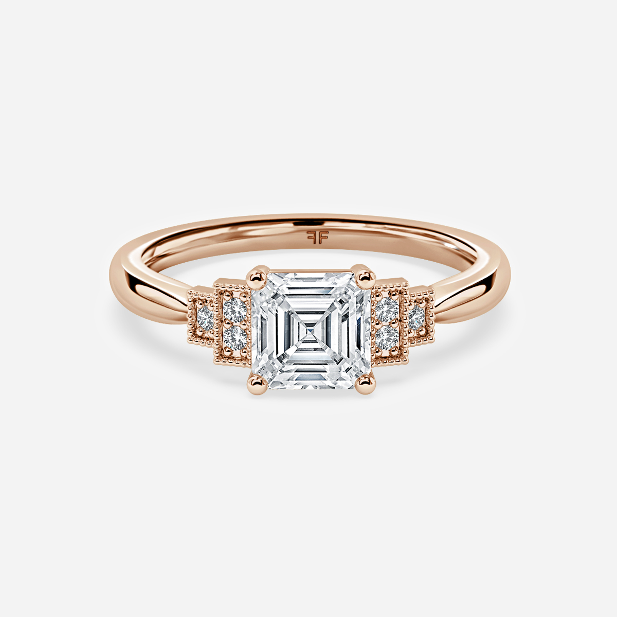 This classic rose gold trilogy style engagement ring defines a dazzling cluster of round shape diamonds that gently tapers towards a diamond accent on each side of the center diamond creates a light and lustrous look. Handcrafted in Hatton Garden, London. Center Diamond Not Included Setting Only
