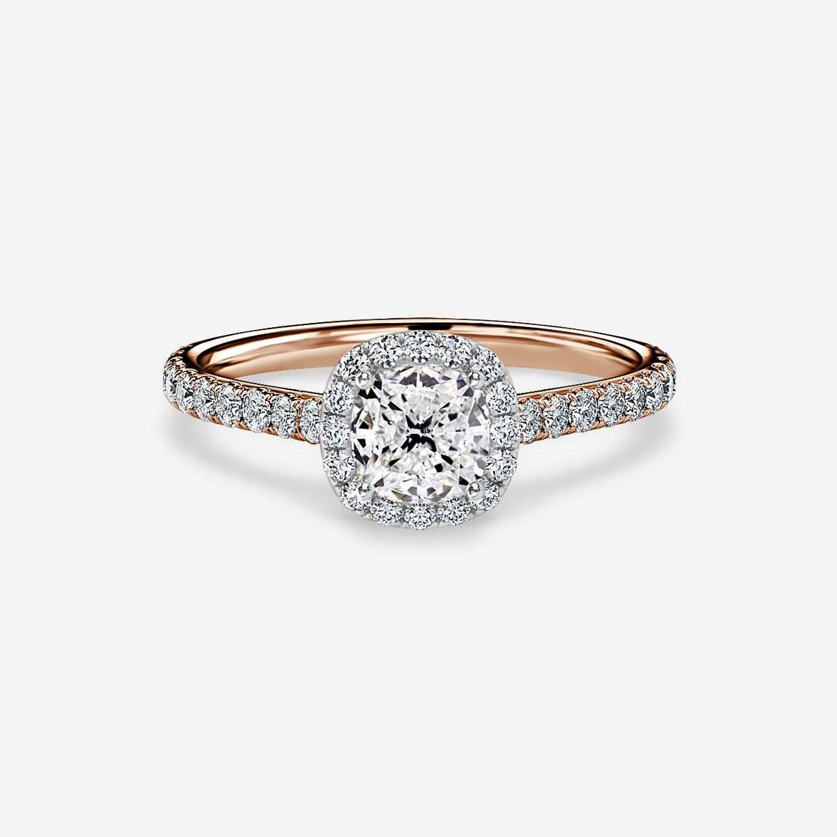 A rose gold two tone pave set diamond halo engagement ring featuring timeless brilliance with a gleam of sparkle, perfect for your special someone. Handcrafted by our master jewellers in Hatton Gardens, London. Centre Diamond Not Included Setting Only