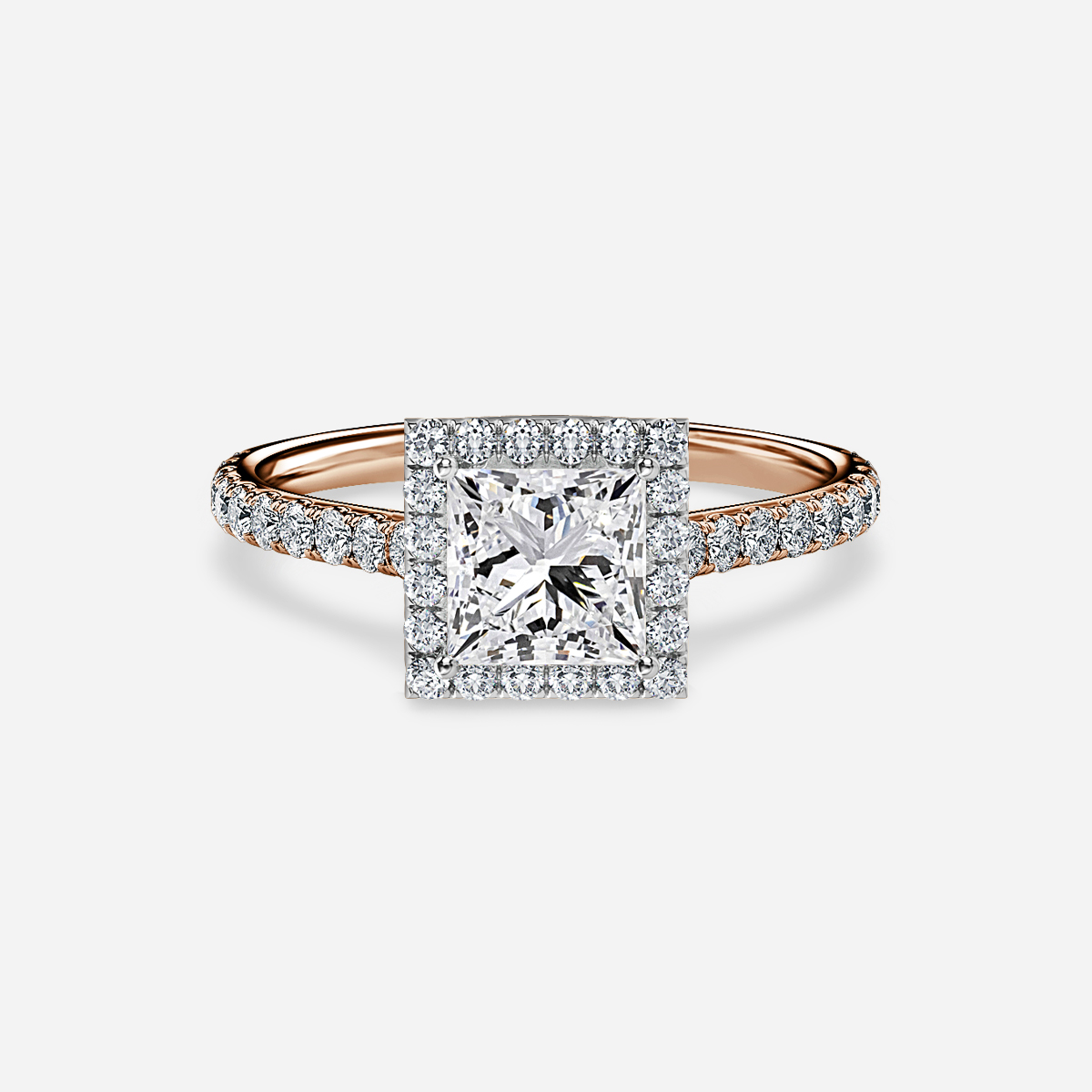 A rose gold two tone pave set diamond halo engagement ring featuring timeless brilliance with a gleam of sparkle, perfect for your special someone. Handcrafted by our master jewellers in Hatton Gardens, London. Centre Diamond Not Included Setting Only