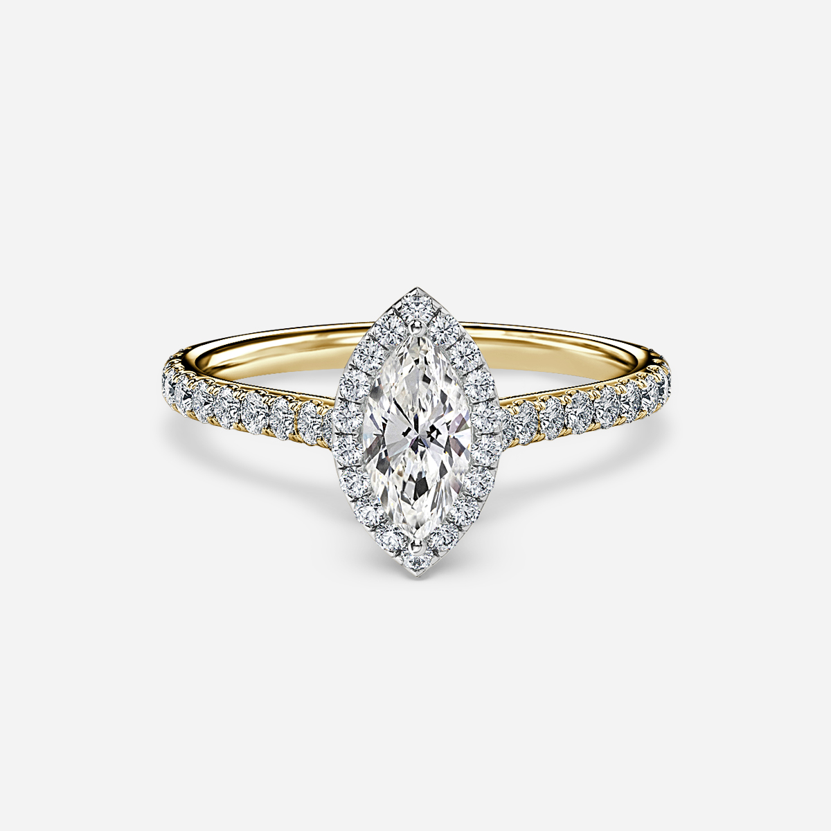 A yellow gold two tone pave set diamond halo engagement ring featuring timeless brilliance with a gleam of sparkle, perfect for your special someone. Handcrafted by our master jewellers in Hatton Gardens, London. Centre Diamond Not Included Setting Only