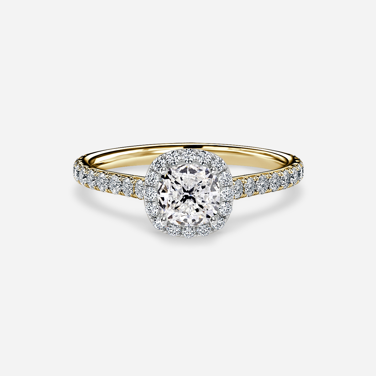 A yellow gold two tone pave set diamond halo engagement ring featuring timeless brilliance with a gleam of sparkle, perfect for your special someone. Handcrafted by our master jewellers in Hatton Gardens, London. Centre Diamond Not Included Setting Only