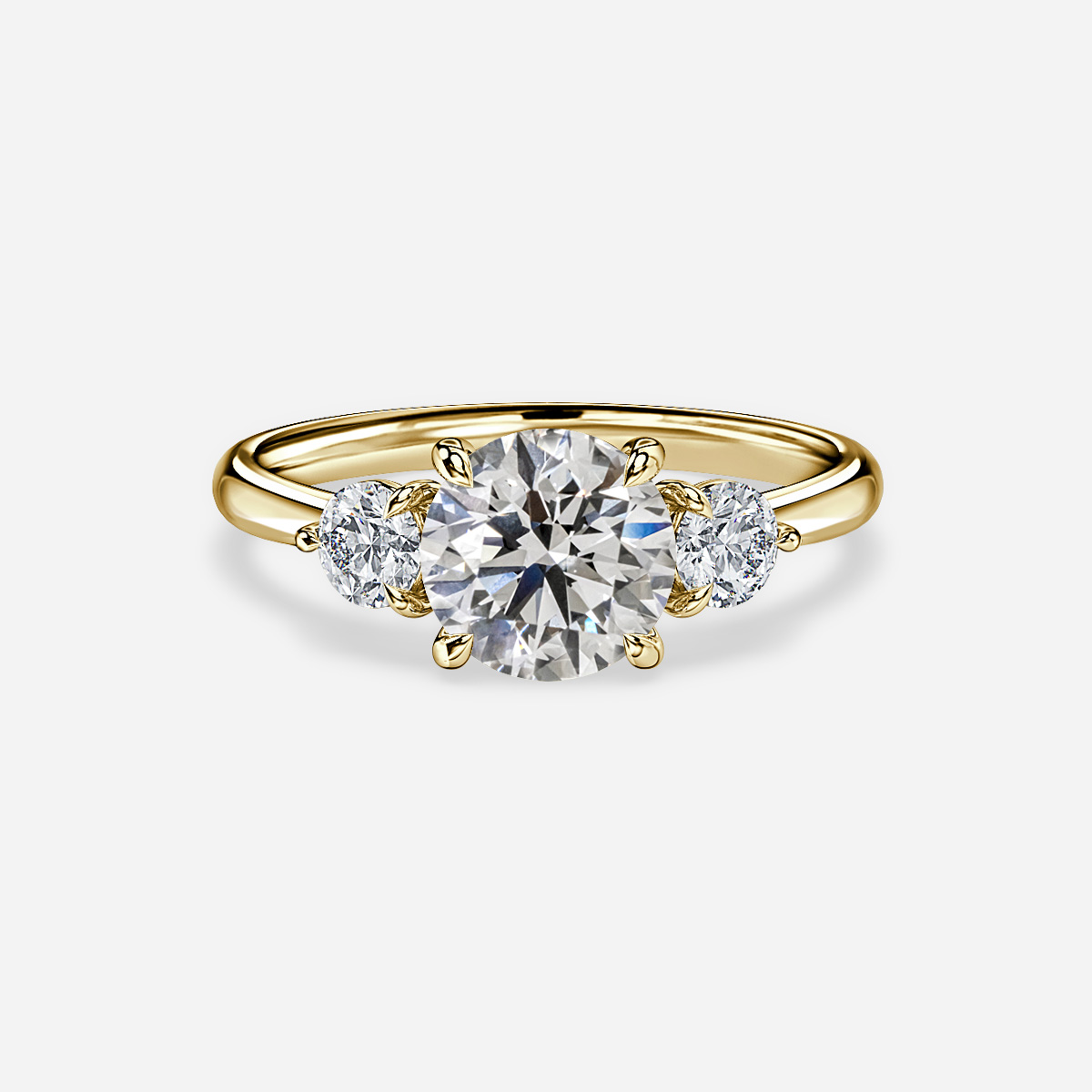 A yellow gold trilogy engagement ring features a delicate band designed to hold three stones. The setting includes stones on either side of the center diamond, creating an elegant and timeless look. Handcrafted in Hatton Gardens, London. Centre Diamond Not Included. Setting only.