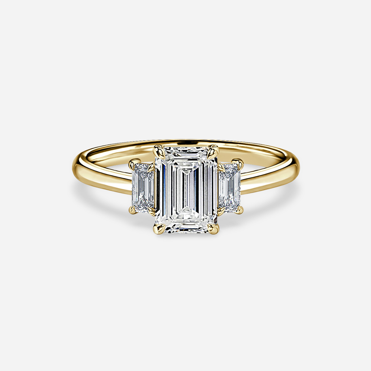 A yellow gold trilogy engagement ring features a delicate band designed to hold three stones. The setting includes stones on either side of the center diamond, creating an elegant and timeless look. Handcrafted in Hatton Gardens, London. Centre Diamond Not Included. Setting only.
