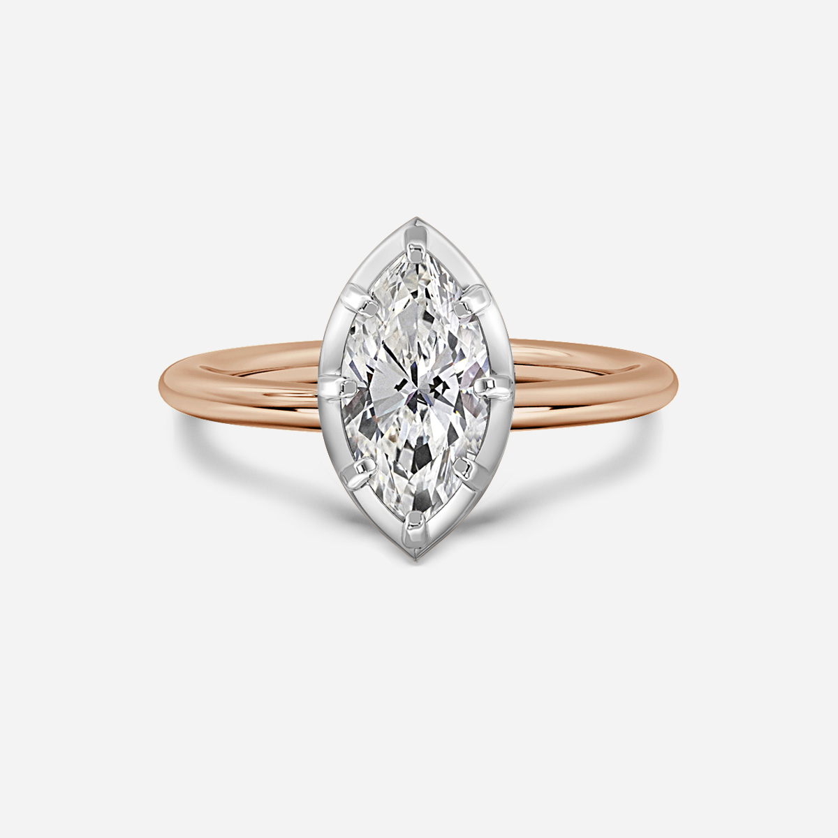 The Charlotte ring features a brilliant center diamond in a sleek platinum bezel. Set on a polished rose gold band, it offers a refined two-tone look. A perfect blend of modern simplicity and timeless elegance. Handcrafted in Hatton Gardens, London. Diamond Center Not Included Setting Only