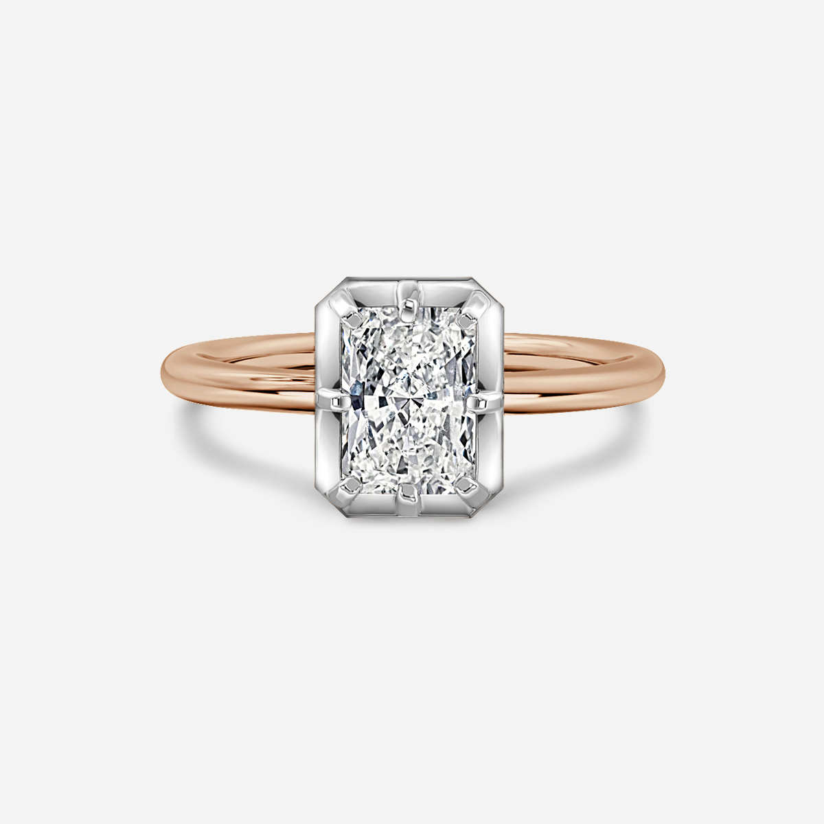 The Charlotte ring features a brilliant center diamond in a sleek platinum bezel. Set on a polished rose gold band, it offers a refined two-tone look. A perfect blend of modern simplicity and timeless elegance. Handcrafted in Hatton Gardens, London. Diamond Center Not Included Setting Only