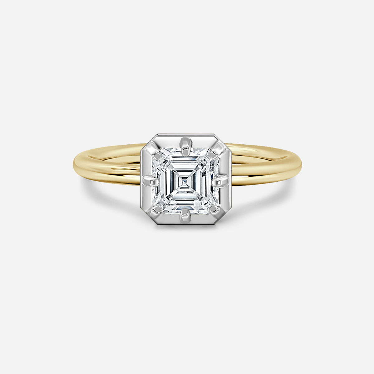 The Charlotte ring features a brilliant center diamond in a sleek platinum bezel. Set on a polished yellow gold band, it offers a refined two-tone look. A perfect blend of modern simplicity and timeless elegance. Handcrafted in Hatton Gardens, London. Diamond Center Not Included Setting Only