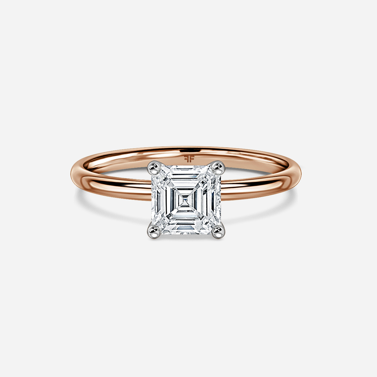 A classic rose gold two tone solitaire engagement ring supported by four prongs and delicate plain band. Handcrafted in Hatton Garden, London Centre Diamond Not Included Setting Only