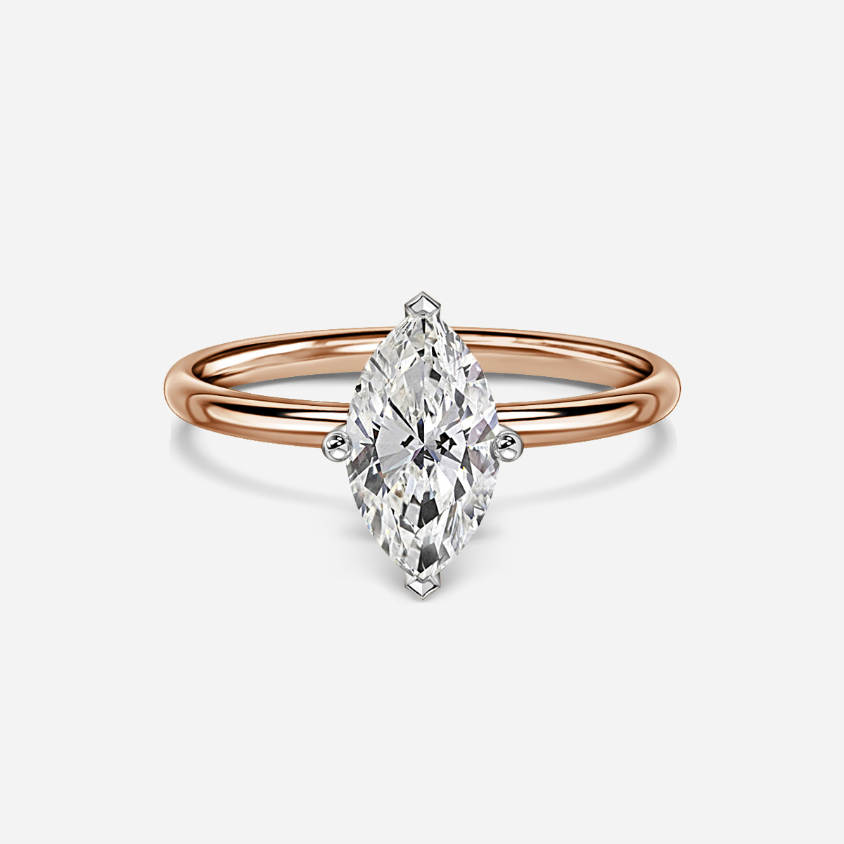 A classic rose gold two tone solitaire engagement ring supported by four prongs and delicate plain band. Handcrafted in Hatton Garden, London Centre Diamond Not Included Setting Only