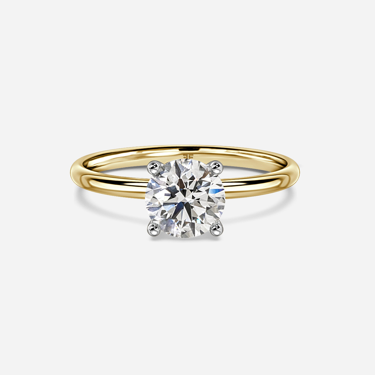 A classic yellow gold two tone solitaire engagement ring supported by four prongs and delicate plain band. Handcrafted in Hatton Garden, London Centre Diamond Not Included Setting Only