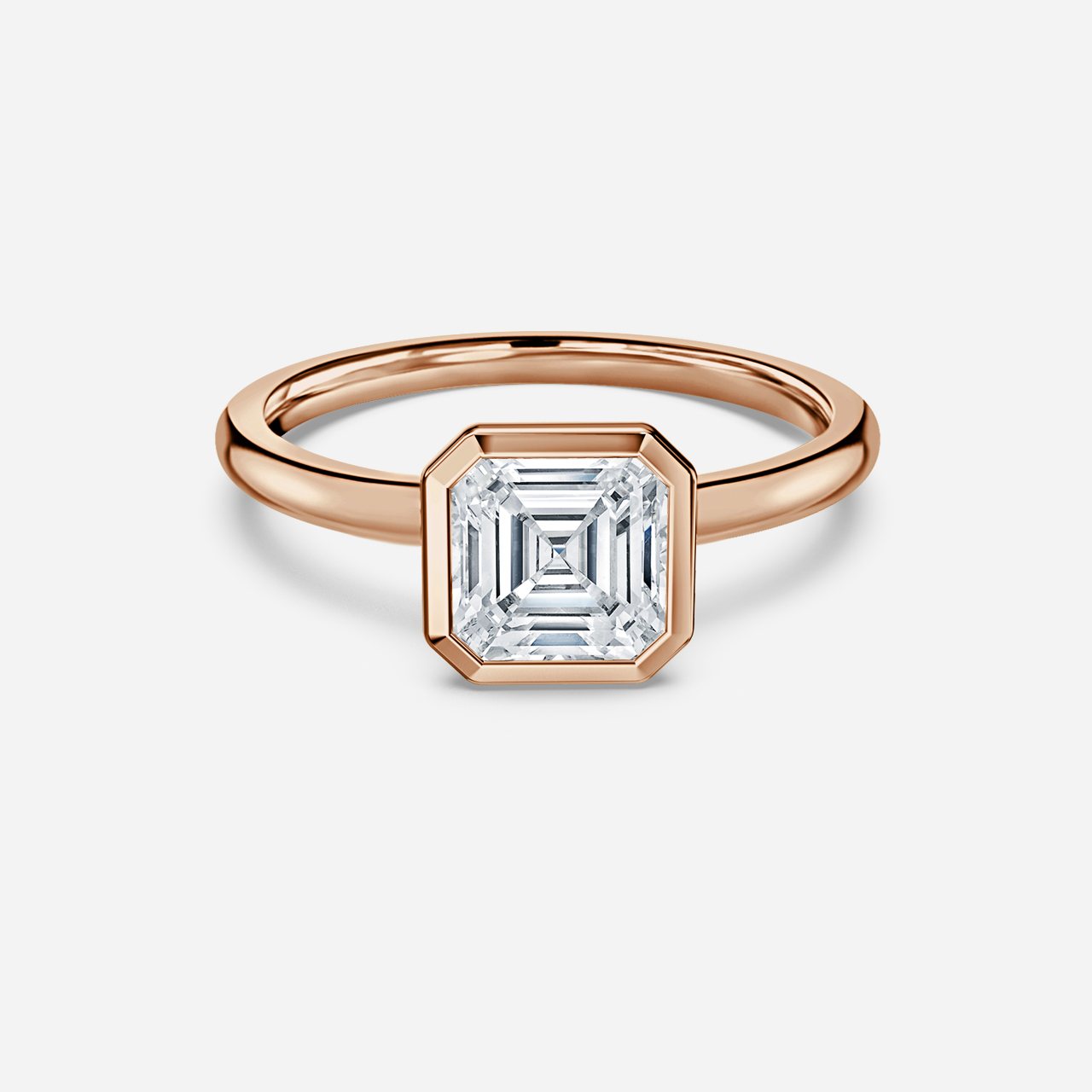 A beautiful and contemporary, this exquisite bezel set rose gold engagement ring features a bezel set centre stone within a basket setting for a unique look. Handcrafted in Hatton Gardens, London. Centre Diamond Not Included Setting Only