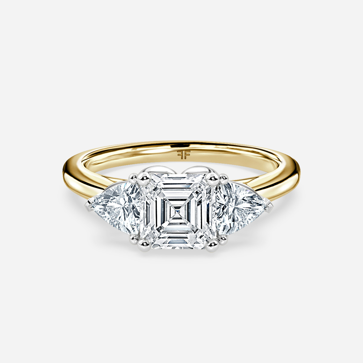 The trillion cut diamond trilogy yellow gold two tone engagement ring is a luxurious and timeless piece of jewelry. The three diamonds in a straight row setting showcase the brilliance of the stones and the enduring elegance of white gold. Handcrafted in Hatton Garden, London Center Diamond Not Included Setting Only