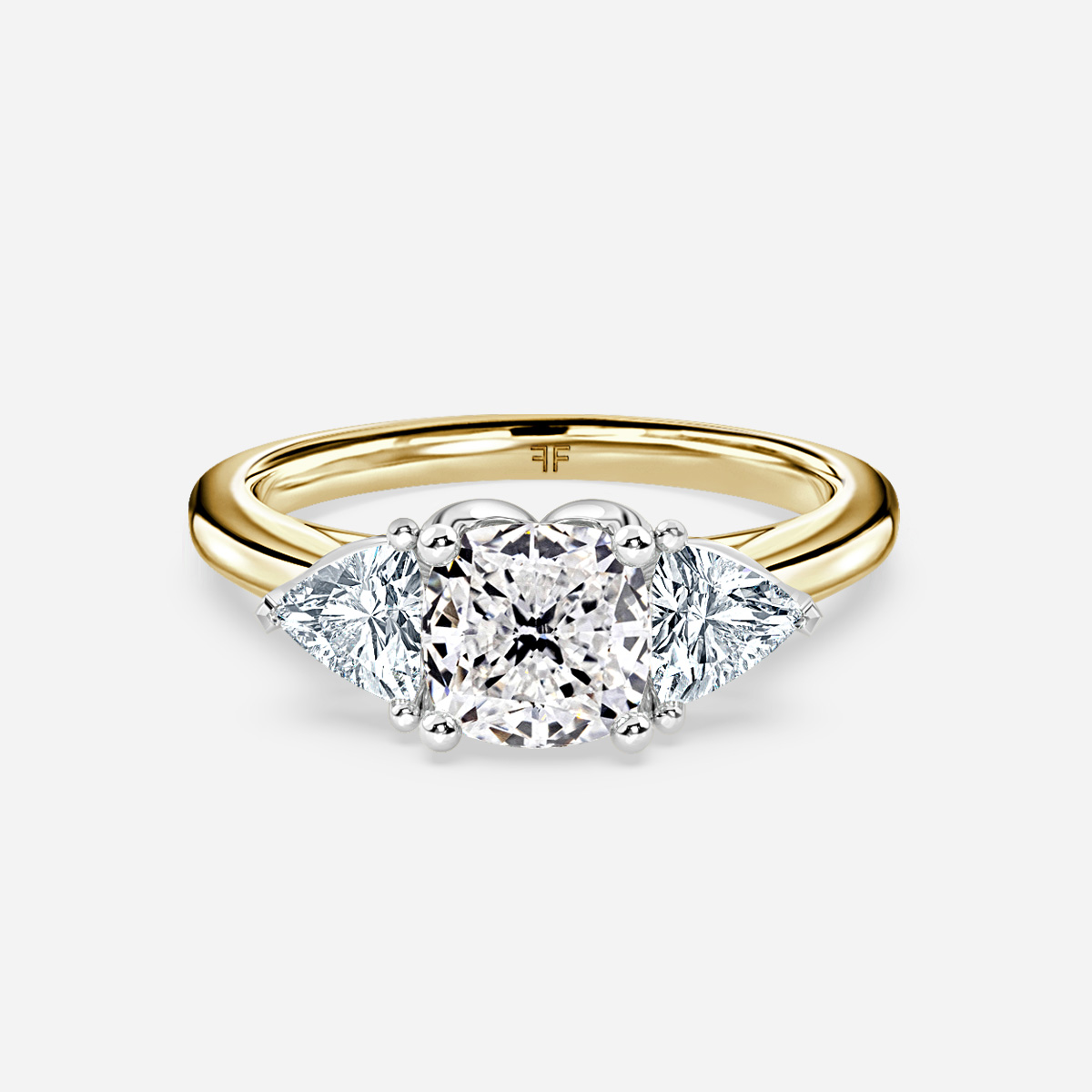 The trillion cut diamond trilogy yellow gold two tone engagement ring is a luxurious and timeless piece of jewelry. The three diamonds in a straight row setting showcase the brilliance of the stones and the enduring elegance of white gold. Handcrafted in Hatton Garden, London Center Diamond Not Included Setting Only