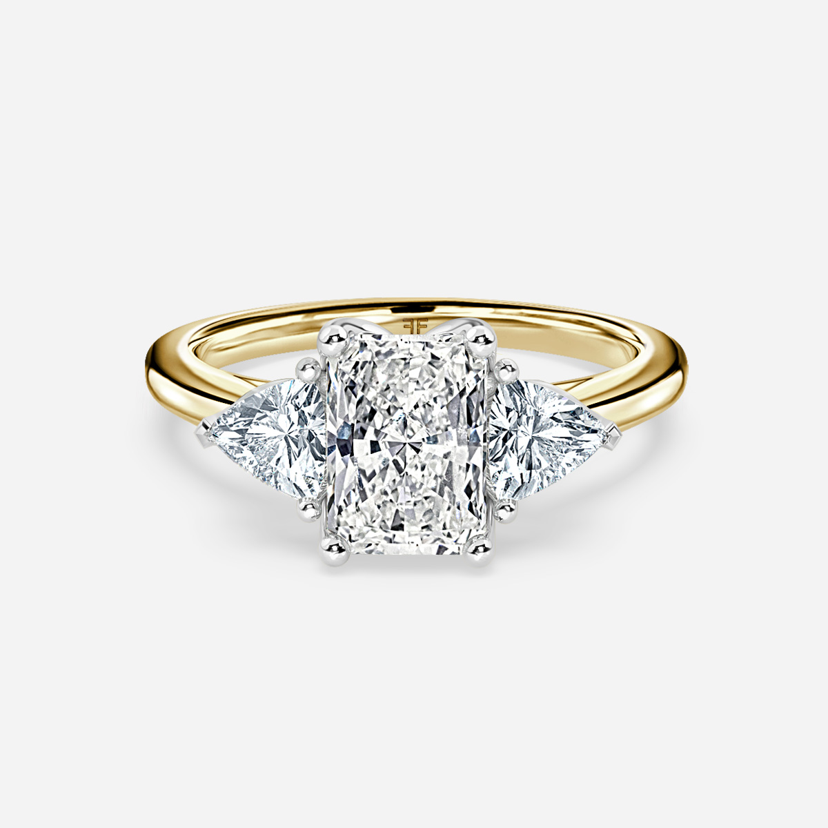 The trillion cut diamond trilogy yellow gold two tone engagement ring is a luxurious and timeless piece of jewelry. The three diamonds in a straight row setting showcase the brilliance of the stones and the enduring elegance of white gold. Handcrafted in Hatton Garden, London Center Diamond Not Included Setting Only