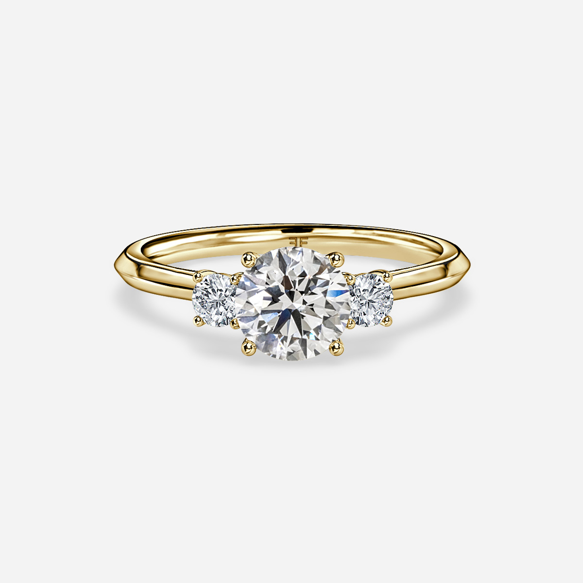 This yellow gold trilogy engagement ring features four claws to embrace two brilliant diamond side stone with that symbolize the past, present, and future tale of your relationship. Handcrafted in Hatton Garden, London Centre Diamond Not Included Setting Only