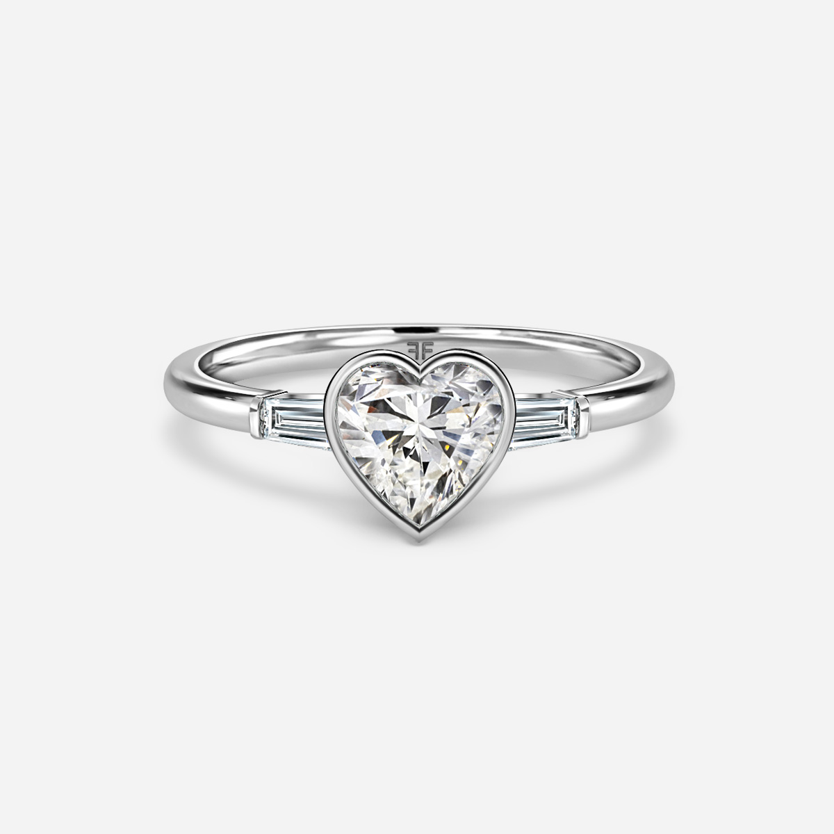 The Dawn Platinum Trilogy Engagement Ring showcases a sophisticated design, with two tapered baguette diamonds gracefully complementing a central diamond. Crafted in platinum, the centerpiece is meticulously held in a bezel setting, accentuating its inherent beauty and enduring elegance. Handcrafted in Hatton Gardens, London. Centre Diamond Not Included Setting Only