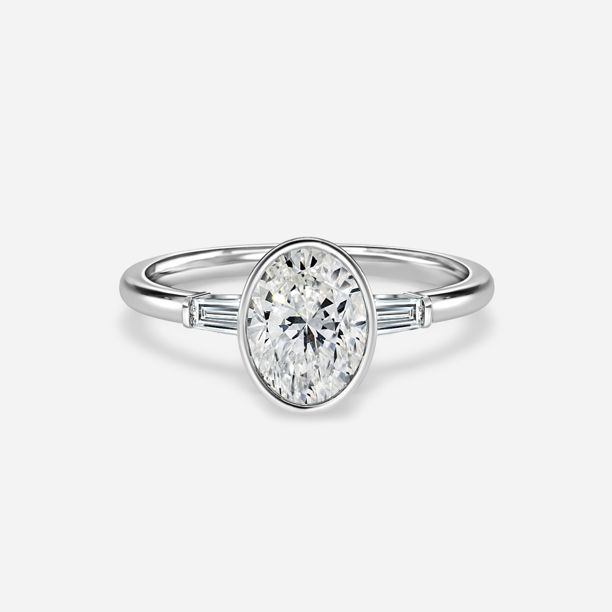 The Dawn Platinum Trilogy Engagement Ring showcases a sophisticated design, with two tapered baguette diamonds gracefully complementing a central diamond. Crafted in platinum, the centerpiece is meticulously held in a bezel setting, accentuating its inherent beauty and enduring elegance. Handcrafted in Hatton Gardens, London. Centre Diamond Not Included Setting Only