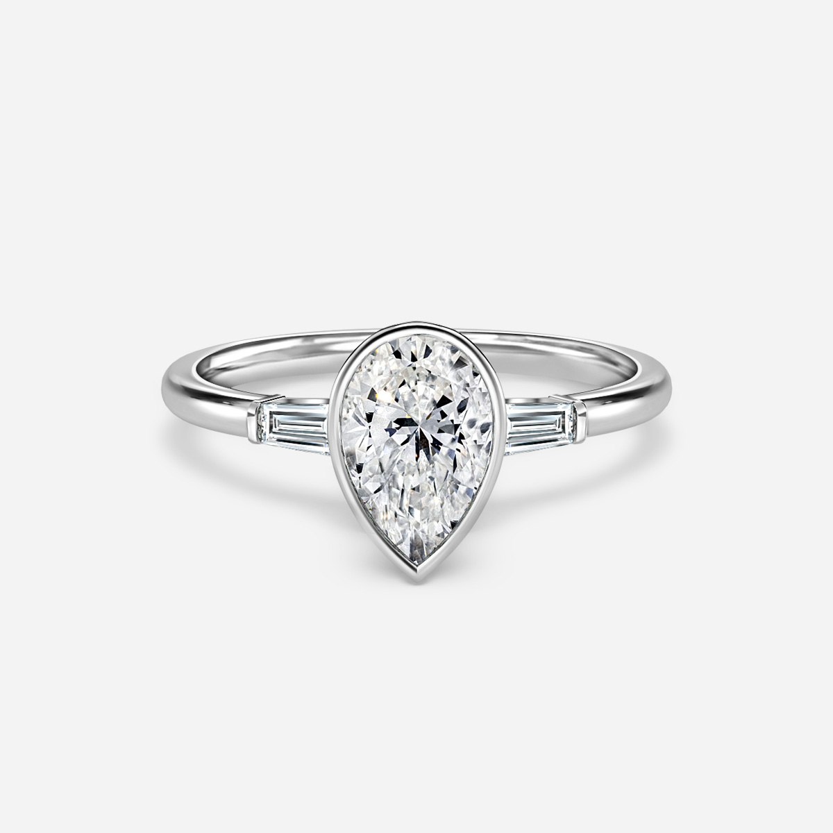 The Dawn Platinum Trilogy Engagement Ring showcases a sophisticated design, with two tapered baguette diamonds gracefully complementing a central diamond. Crafted in platinum, the centerpiece is meticulously held in a bezel setting, accentuating its inherent beauty and enduring elegance. Handcrafted in Hatton Gardens, London. Centre Diamond Not Included Setting Only