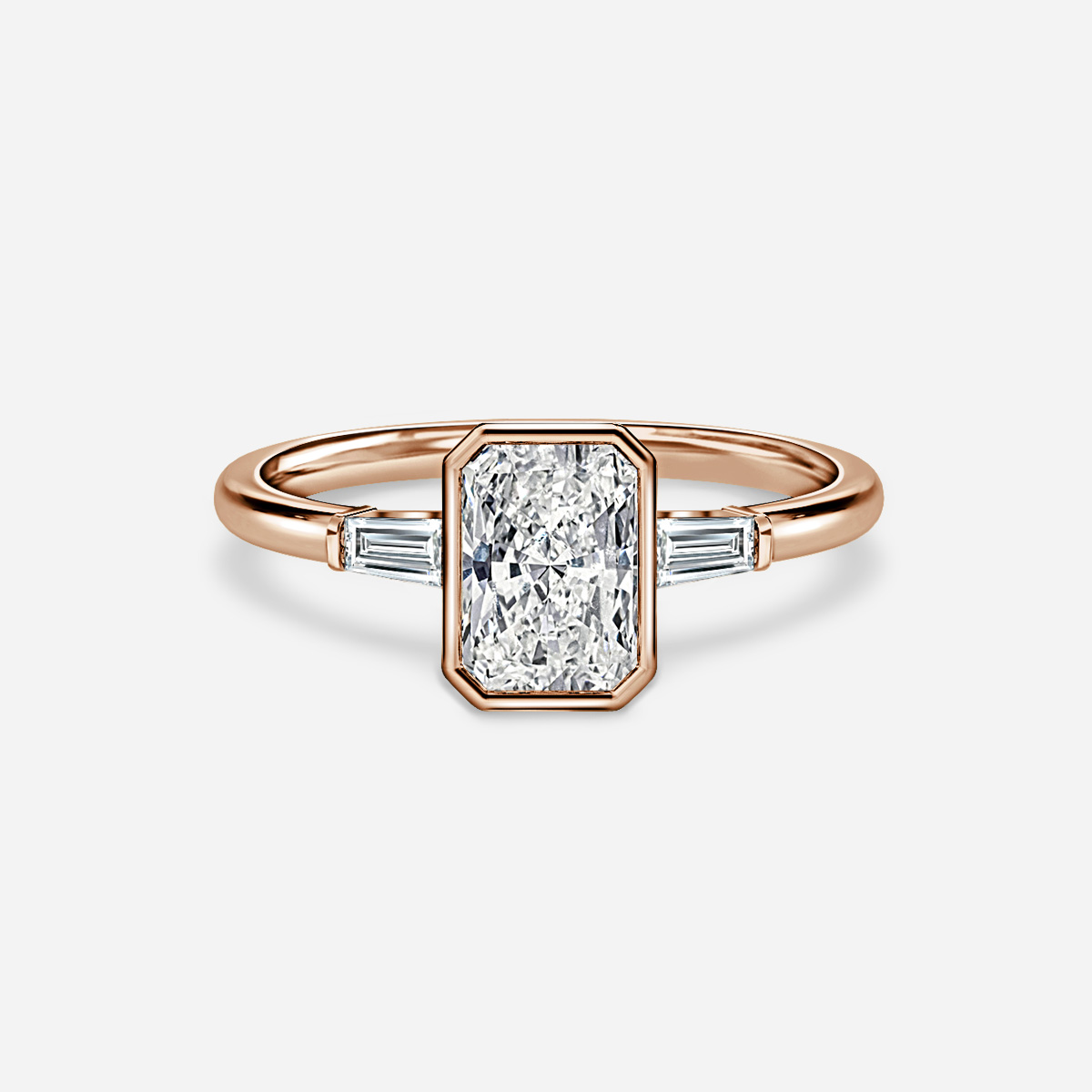 Elevate your love story with the Dawn Rose Gold Bezel Engagement Ring, showcasing a radiant center diamond securely nestled in a sleek bezel setting. Flanked by two exquisite tapered baguette diamonds on each side, this ring combines timeless elegance with modern sophistication. Handcrafted in Hatton Gardens, London. Centre Diamond Not Included Setting Only