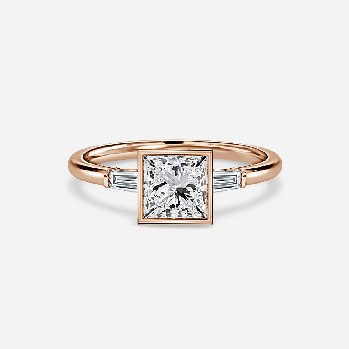 The Dawn Rose Gold Trilogy Engagement Ring showcases a sophisticated design, with two tapered baguette diamonds gracefully complementing a central diamond. Crafted in rose gold, the centerpiece is meticulously held in a bezel setting, accentuating its inherent beauty and enduring elegance. Handcrafted in Hatton Gardens, London. Centre Diamond Not Included Setting Only
