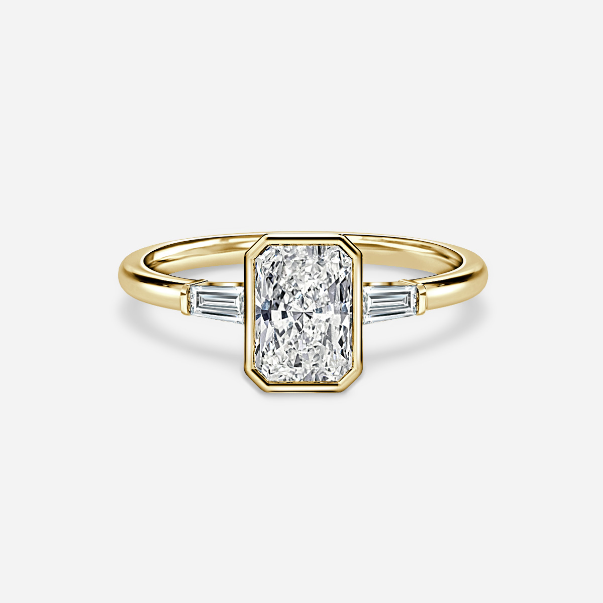 Elevate your love story with the Dawn Yellow Gold Bezel Engagement Ring, showcasing a radiant center diamond securely nestled in a sleek bezel setting. Flanked by two exquisite tapered baguette diamonds on each side, this ring combines timeless elegance with modern sophistication. Handcrafted in Hatton Gardens, London. Centre Diamond Not Included Setting Only