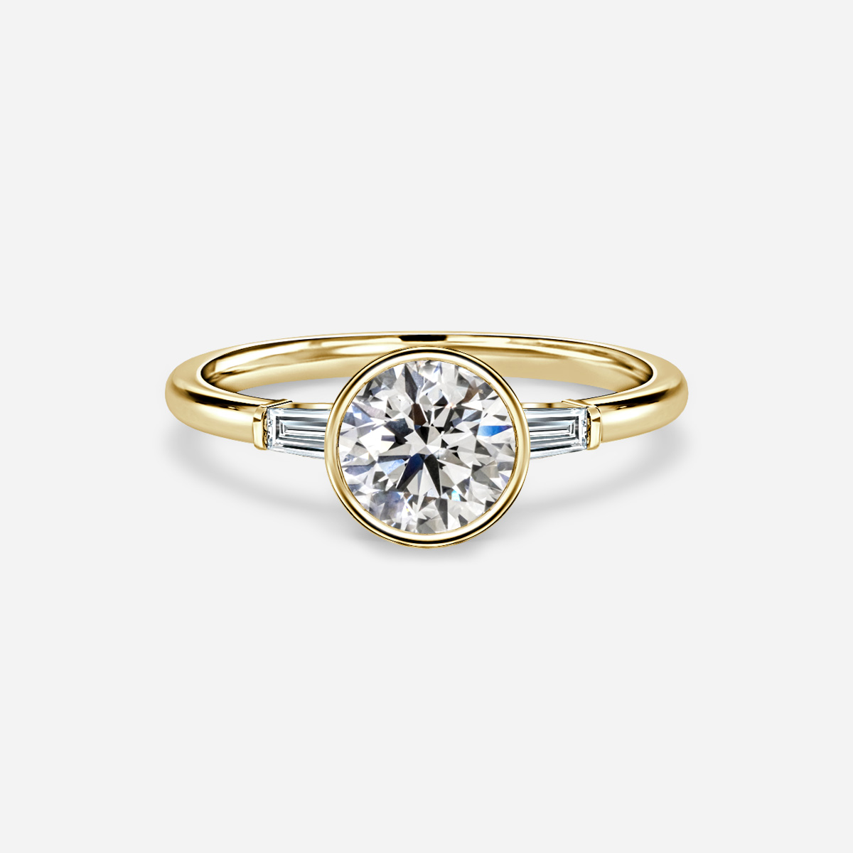 The Dawn Yellow Gold Trilogy Engagement Ring showcases a sophisticated design, with two tapered baguette diamonds gracefully complementing a central diamond. Crafted in yellow gold, the centerpiece is meticulously held in a bezel setting, accentuating its inherent beauty and enduring elegance. Handcrafted in Hatton Gardens, London. Centre Diamond Not Included Setting Only