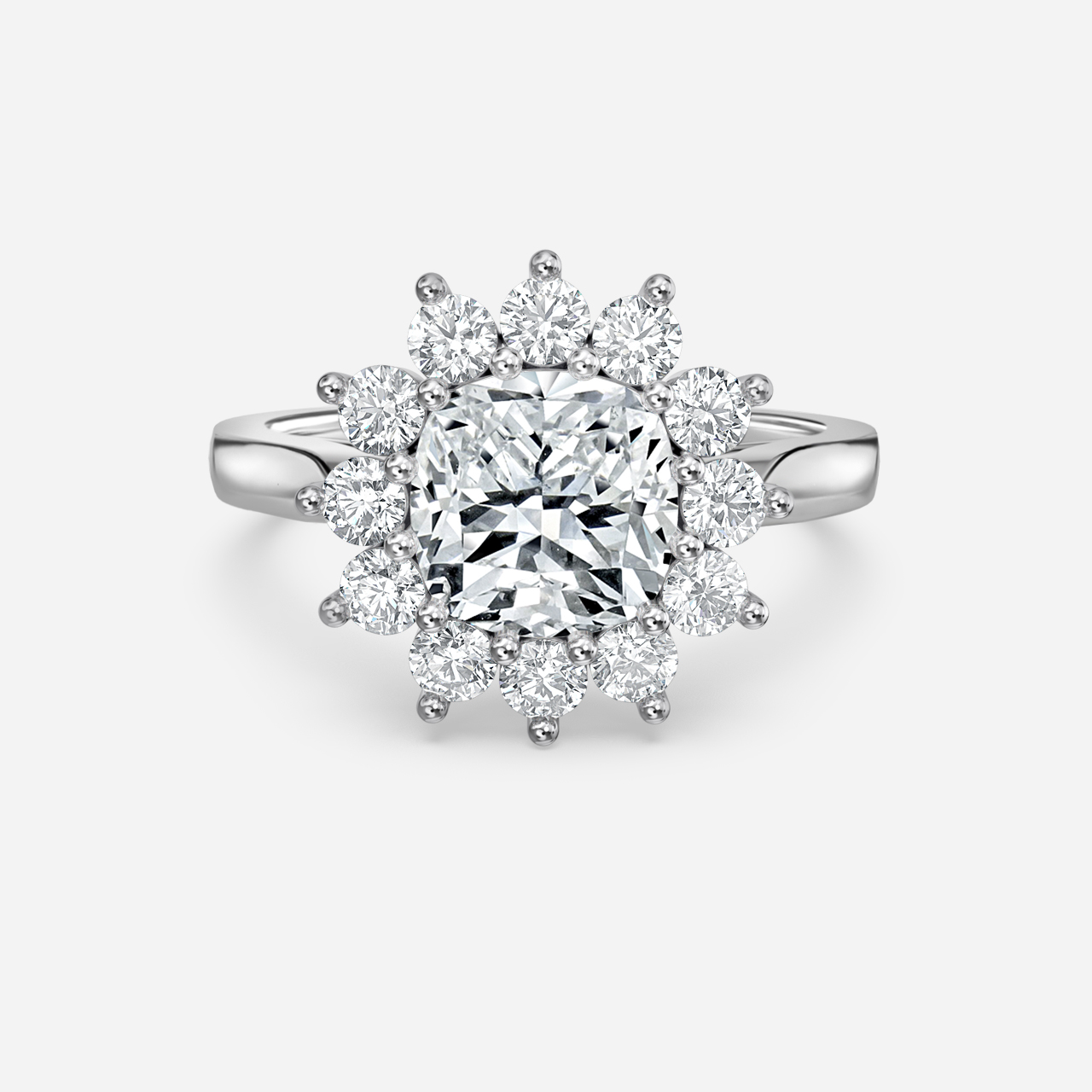 A platinum cluster diamond engagement ring is a stunning and unique piece of jewelry featuring a cluster of intricate stones set in a stylish design. It is perfect for expressing your everlasting love and commitment. Handcrafted in Hatton Gardens, London. Centre Diamond Not Included Setting Only