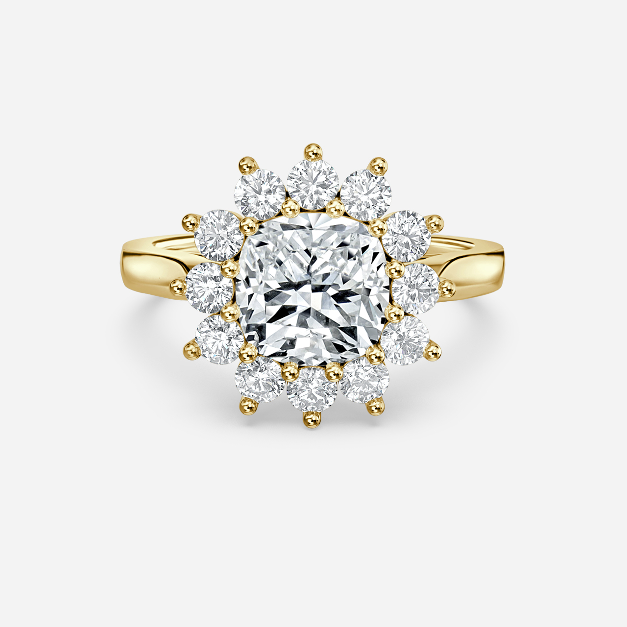 A yellow gold cluster diamond engagement ring is a stunning and unique piece of jewelry featuring a cluster of intricate stones set in a stylish design. It is perfect for expressing your everlasting love and commitment. Handcrafted in Hatton Gardens, London. Centre Diamond Not Included Setting Only