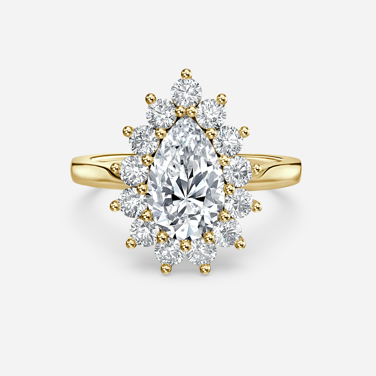 A yellow gold cluster diamond engagement ring is a stunning and unique piece of jewelry featuring a cluster of intricate stones set in a stylish design. It is perfect for expressing your everlasting love and commitment. Handcrafted in Hatton Gardens, London. Centre Diamond Not Included Setting Only