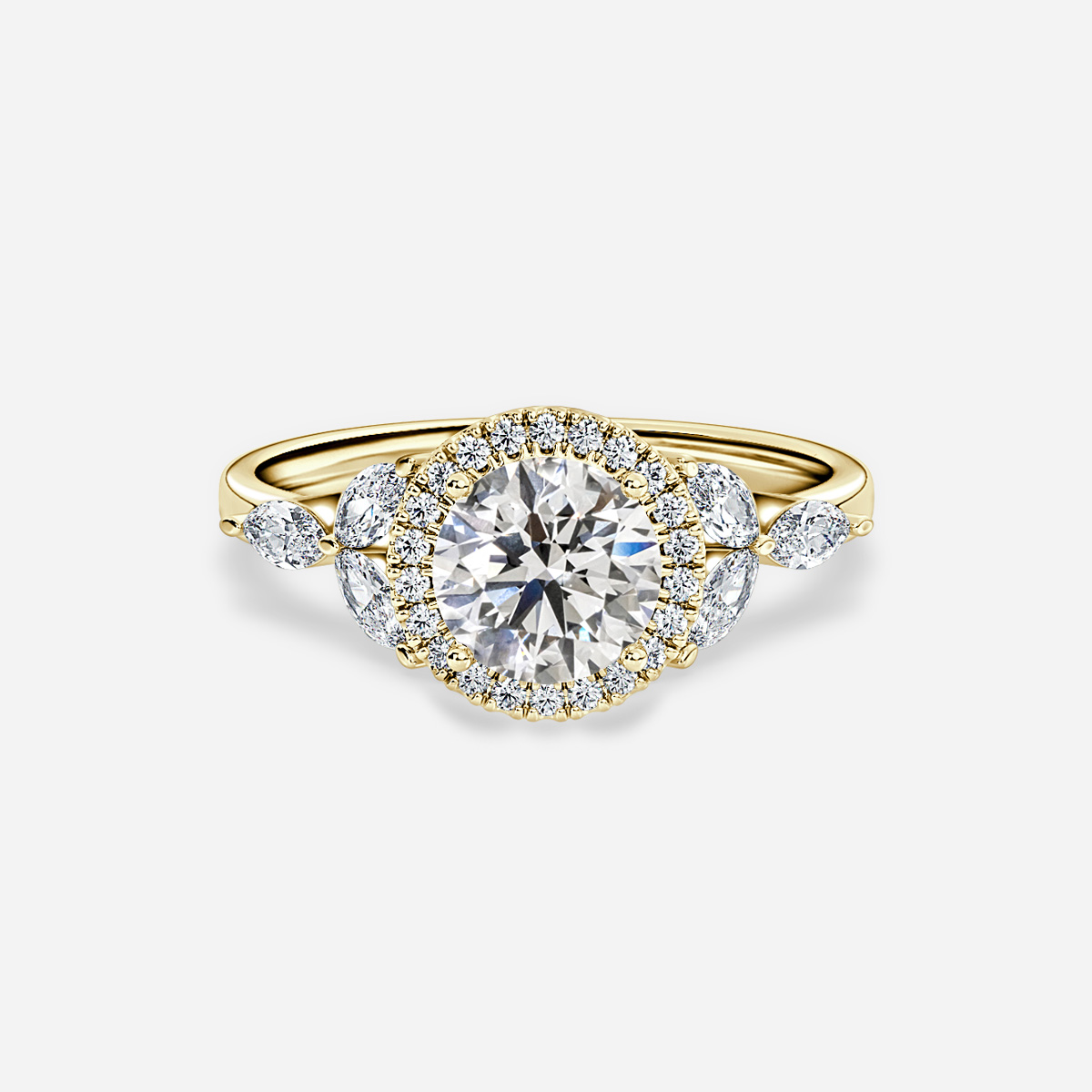 This yellow gold engagement ring, features a delicate halo of smaller round cut diamonds that are micro set. There is an added feature of 3 beautifully cut small marquise diamonds on either side of the centre stone. Handcrafted by our master jewellers in Hatton Gardens, London. Centre Diamond Not Included Setting Only