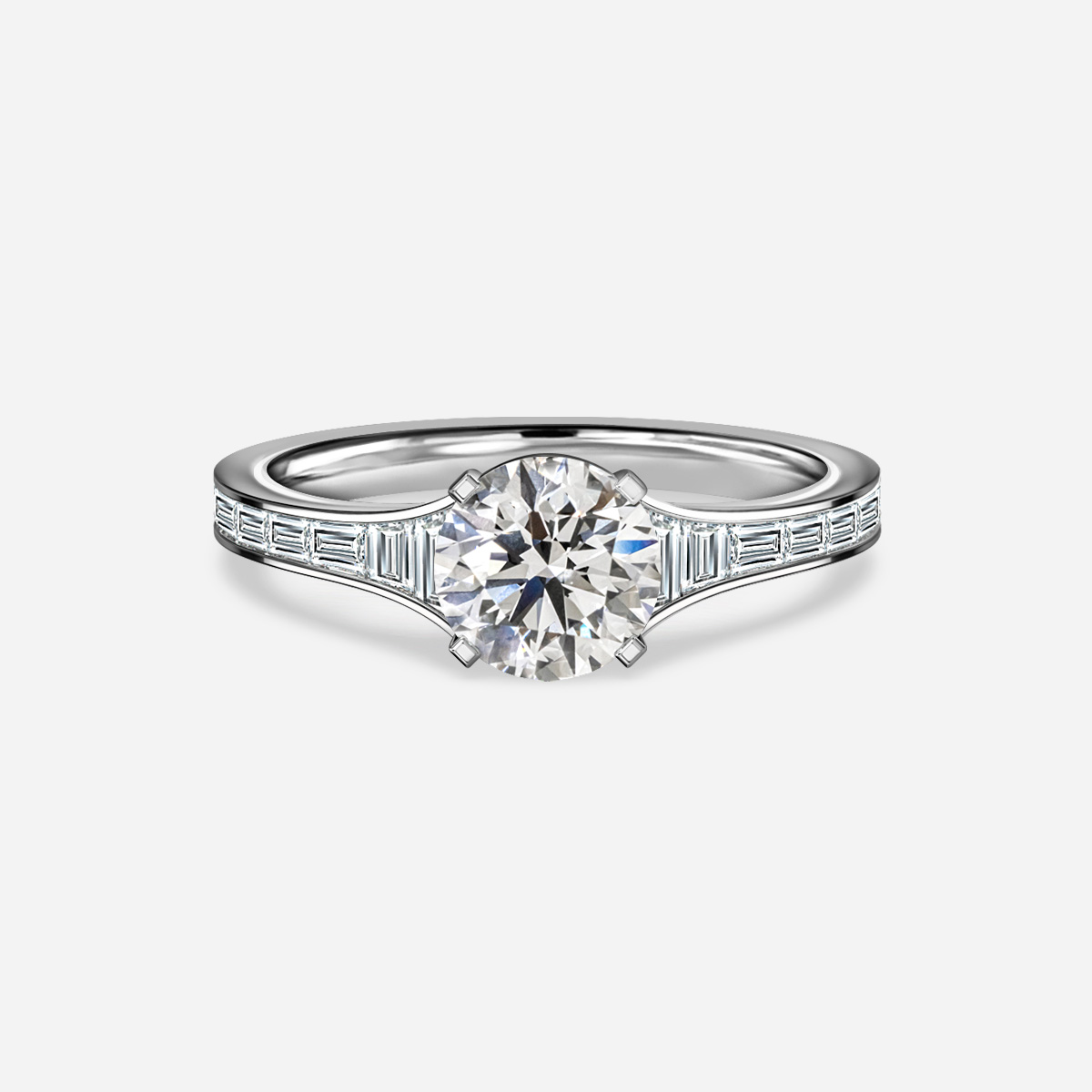 The Eloise Platinum Unique Engagement Ring showcases exquisite baguette diamonds on a lustrous platinum band. This timeless design beautifully enhances the central stone, creating an elegant and refined look. Handcrafted in Hatton Gardens, London. Centre Diamond Not Included Setting Only