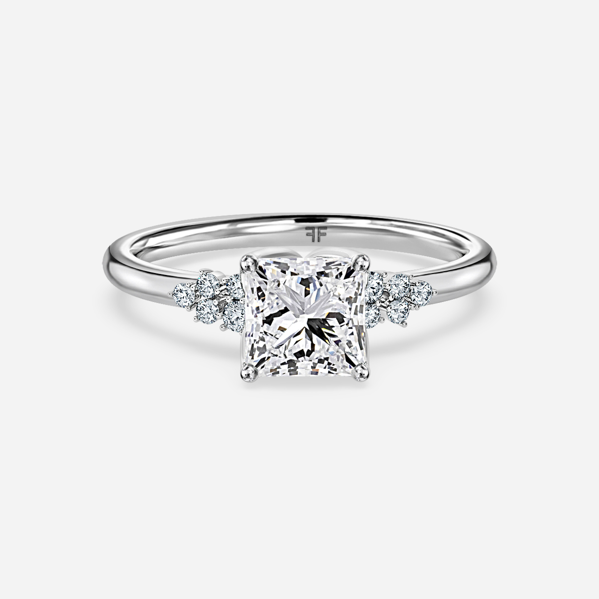 A platinum flower engagement ring features side stones are set in a triangular shape, creating a unique and eye-catching look that wraps around the main center diamond. This creates a distinct and luxurious look that will be sure to stand out from the crowd. Handcrafted in Hatton Gardens, London. Centre Diamond Not Included Setting Only