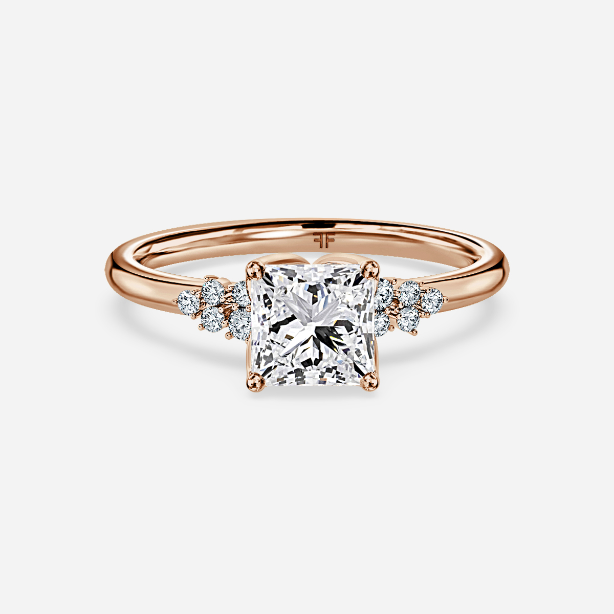 A rose gold flower engagement ring features side stones are set in a triangular shape, creating a unique and eye-catching look that wraps around the main center diamond. This creates a distinct and luxurious look that will be sure to stand out from the crowd. Handcrafted in Hatton Gardens, London. Centre Diamond Not Included Setting Only